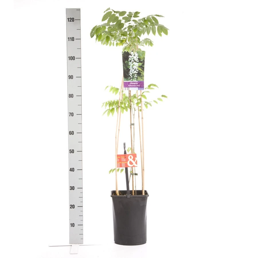 Wisteria floribunda ‘Alba’, bloeit rond mei-juni met lange trossen vol met kleine witte bloemen, die licht geuren. Rond september is nog nabloei mogelijk.