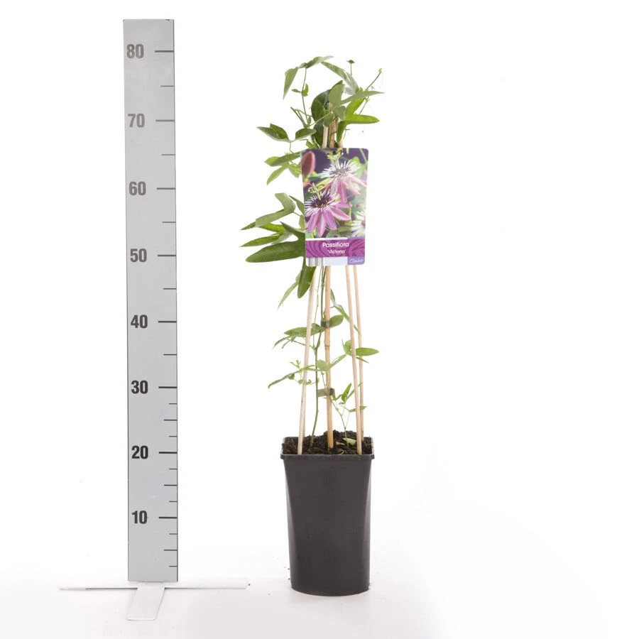 Passiebloem (Passiflora ‘Victoria’) is een klimplant met prachtige bloemen, de Passiebloem ‘Victoria’ heeft een paarse bloem, met een witte kroon en groen/paarse stampers. De Passiebloem ‘Victoria’ is, net als andere soorten uit de Passiflora familie, een goede klimmer die met de jonge scheuten zich om de leidraad, pergola, of takken van andere planten wikkelt en zich na voldoende houvast met grotere scheuten om deze houvast hecht. De Passiebloem ‘Victoria’ heeft een standplaats nodig met volop zon, en zal zijn zonnige plek belonen met een uitbundige bloei. De passiebloem kan tot 3 meter hoog worden. Bij gebruik langs een schutting of andere afscheiding is het aan te raden 3 planten per strekkende meter te gebruiken om een mooi vol resultaat te bereiken. De Passiebloem (Passiflora ‘Victoria’) is matig winterhard en kan tot -6 graden Celsius goed overwinteren. Het kan gebeuren dat bij lagere temperaturen de plant tot dicht boven de grond invriest. De wortels zullen echter pas bij strenge- tot zeer strenge vorst kunnen invriezen. Dit kunt u voorkomen door bij vorst de grond om de plant af te dekken. De Passiebloem ‘Victoria’ is echter een goede groeier, en zal snel weer mooi in bloei staan.